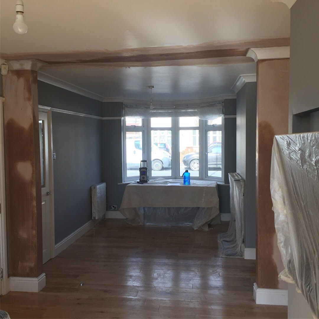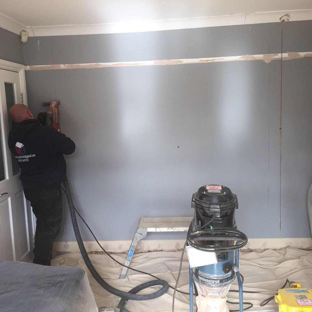 Removal of external render and pebble dash, render repairs, pebble dashing, plaster boarding, skimming and coving.